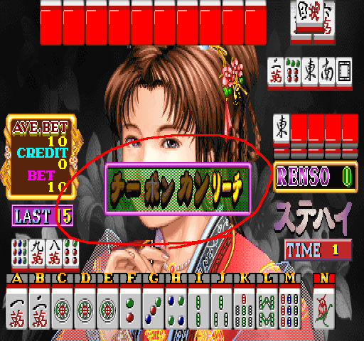 Confirmed the issue. This game uses a special key input scheme for the keyboard mode. In usual mahjang games, when you declare Chi, Pon, Kan, Reach and Ron, you have to press the respective keys. In bishjan, a menu appears when you can declare any of them and then chose it. (see the screenshot) In the joystick mode, button 1 is to cancel, button 2 is to accept, but in the keyboard mode, I can't find the key to accept it as far as I tested. |