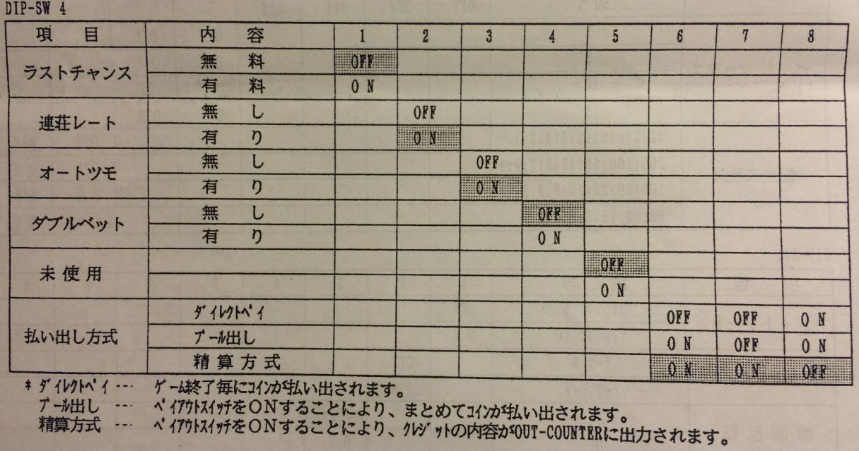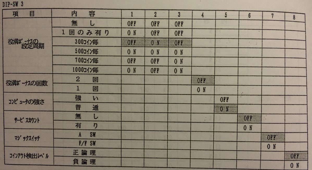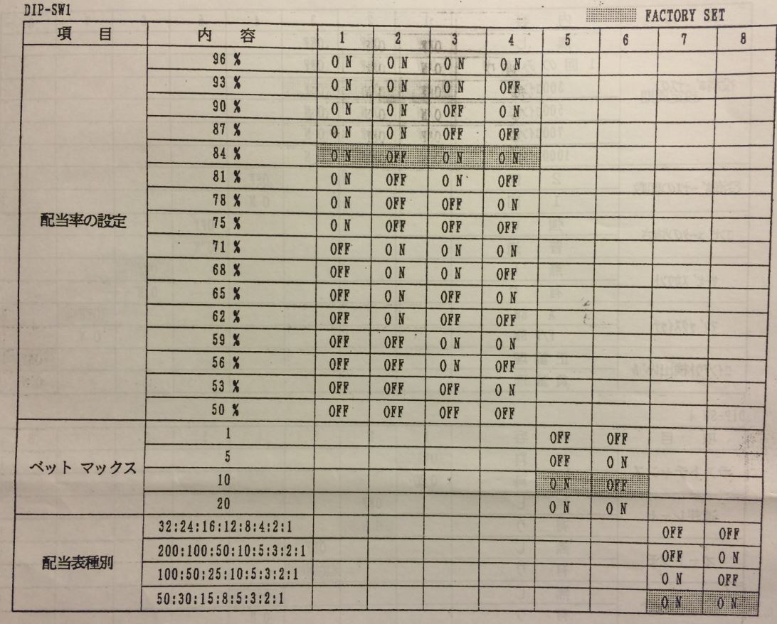 DIP EXPLANATION TEXT [Show Content] [Hide Content]Real Mahjong Gold YUMEHAI DIP-SW1: --------------------------------------------------------------------------------- | ITEM | FUNCTION | 1 | 2 | 3 | 4 | 5 | 6 | 7 | 8 | --------------------------------------------------------------------------------- | | 96% |ON |ON |ON |ON | | | | | | | 93% |ON |ON |ON |OFF| | | | | | | 90% |ON |ON |OFF|ON | | | | | | | 87% |ON |ON |OFF|OFF| | | | | | | 84% * |ON |OFF|ON |ON | | | | | | | 81% |ON |OFF|ON |OFF| | | | | | DIVIDEND RATIO | 78% |ON |OFF|OFF|ON | | | | | | SETTINGS | 75% |ON |OFF|OFF|OFF| | | | | | | 71% |OFF|ON |ON |ON | | | | | | | 68% |OFF|ON |ON |OFF| | | | | | | 65% |OFF|ON |OFF|ON | | | | | | | 62% |OFF|ON |OFF|OFF| | | | | | | 59% |OFF|OFF|ON |ON | | | | | | | 56% |OFF|OFF|ON |OFF| | | | | | | 53% |OFF|OFF|OFF|ON | | | | | | | 50% |OFF|OFF|OFF|OFF| | | | | --------------------------------------------------------------------------------- | | 1 | | | | |OFF|OFF| | | | BET MAX | 5 | | | | |OFF|ON | | | | | 10 * | | | | |ON |OFF| | | | | 20 | | | | |ON |ON | | | --------------------------------------------------------------------------------- | | 32: 24:16:12:8:4:2:1 | | | | | | |OFF|OFF| | DISTRIBUTION LIST | 200:100:50:10:5:3:2:1 | | | | | | |OFF|ON | | | 100: 50:25:10:5:3:2:1 | | | | | | |ON |OFF| | | 50: 30:15: 8:5:3:2:1*| | | | | | |ON |ON | --------------------------------------------------------------------------------- DIP-SW2: --------------------------------------------------------------------------------- | ITEM | FUNCTION | 1 | 2 | 3 | 4 | 5 | 6 | 7 | 8 | --------------------------------------------------------------------------------- | NOTE RATE | COINS x5 * |OFF| | | | | | | | | | COINS x10 |ON | | | | | | | | --------------------------------------------------------------------------------- | GAME STYLE | TABLE | |OFF| | | | | | | | | UPRIGHT * | |ON | | | | | | | --------------------------------------------------------------------------------- | SCREEN ORIENTATION | NORMAL * | | |OFF| | | | | | | | FLIP SCREEN | | |ON | | | | | | --------------------------------------------------------------------------------- | UNUSED | * | | | |OFF| | | | | | | | | | |ON | | | | | --------------------------------------------------------------------------------- | MIN. NUMBER OF RATE | RATE 1 * | | | | |OFF|OFF| | | | AT GAME STARTED | RATE 2 | | | | |OFF|ON | | | | | RATE 3 | | | | |ON |OFF| | | | | RATE 5 | | | | |ON |ON | | | --------------------------------------------------------------------------------- | | 1 COIN 1 CREDIT * | | | | | | |OFF|OFF| | COIN RATE | 1 COIN 5 CREDITS | | | | | | |ON |OFF| | | 1 COIN 2 CREDITS | | | | | | |OFF|ON | | | 1 COIN 10 CREDITS | | | | | | |ON |ON | --------------------------------------------------------------------------------- DIP-SW3: --------------------------------------------------------------------------------- | ITEM | FUNCTION | 1 | 2 | 3 | 4 | 5 | 6 | 7 | 8 | --------------------------------------------------------------------------------- | | NONE |OFF|OFF|OFF| | | | | | | YAKUMAN BONUS | ONLY ONCE |ON |OFF|ON | | | | | | | FREQUENCY SETTINGS | EVERY 300 COINS * |OFF|ON |OFF| | | | | | | | EVERY 500 COINS |ON |ON |ON | | | | | | | | EVERY 700 COINS |OFF|OFF|OFF| | | | | | | | EVERY 1000 COINS |ON |OFF|ON | | | | | | --------------------------------------------------------------------------------- | COUNTS OF | TWICE * | | | |OFF| | | | | | YAKUMAN BONUS | ONCE | | | |ON | | | | | --------------------------------------------------------------------------------- | CPU LEVEL | DIFFICULT | | | | |OFF| | | | | | NORMAL * | | | | |ON | | | | --------------------------------------------------------------------------------- | SERVICE COUNT | DISABLED * | | | | | |OFF| | | | | ENABLED | | | | | |ON | | | --------------------------------------------------------------------------------- | MAGIC SWITCH | A SW * | | | | | | |OFF| | | | F/F SW | | | | | | |ON | | --------------------------------------------------------------------------------- | DETECT LEVEL OF | POSITIVE LOGIC * | | | | | | | |OFF| | COIN OUT | NEGATIVE LOGIC | | | | | | | |ON | --------------------------------------------------------------------------------- DIP-SW4: --------------------------------------------------------------------------------- | ITEM | FUNCTION | 1 | 2 | 3 | 4 | 5 | 6 | 7 | 8 | --------------------------------------------------------------------------------- | LAST CHANCE | FREE * |OFF| | | | | | | | | | CHARGE |ON | | | | | | | | --------------------------------------------------------------------------------- | RENCHAN RATE | DISABLED | |OFF| | | | | | | | | ENABLED * | |ON | | | | | | | --------------------------------------------------------------------------------- | AUTO TSUMO | DISABLED | | |OFF| | | | | | | | ENABLED * | | |ON | | | | | | --------------------------------------------------------------------------------- | DOUBLE BET | DISABLED | | | |OFF| | | | | | | ENABLED * | | | |ON | | | | | --------------------------------------------------------------------------------- | UNUSED ** | * | | | | |OFF| | | | | | | | | | |ON | | | | --------------------------------------------------------------------------------- | PAYOUT METHOD | DIRECT PAY | | | | | |OFF|OFF|ON | | | POOL OUT | | | | | |ON |OFF|ON | | | PAY OFF * | | | | | |ON |ON |OFF| --------------------------------------------------------------------------------- NOTES: * DEFAULT SETTINGS ** ON MAME THIS SETTING ALREADY DEFINED CORRECTLY PLEASE NOTICE, TEST MENU (F2) SHOWS DIP NUMBERS REVERSE ORDERED (as 87654321) INFOS TAKEN FROM: http://nyamuko.cocolog-nifty.com/blog/2011/04/post-e82c.html?cid=94270137#comment-94270137 | ||||