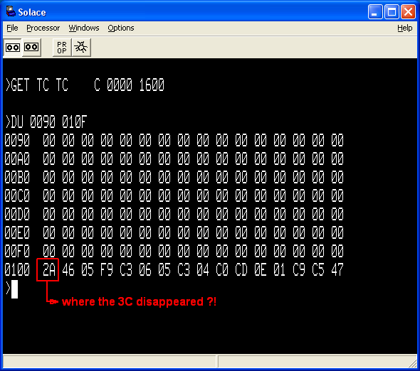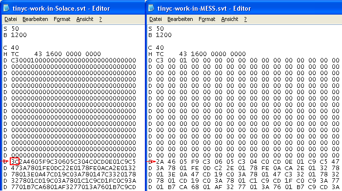 tinyc-work-in-Solace.svt == same as metron.zip from softlist (only the 1st file -> the TC file) tinyc-work-in-MESS.svt == above file modified with data from tc.ent (http://www.sol20.org/tapes/tinyc/tinyc.zip) Note: Hope you know the .ent file is dump of memory, right? Now do following ... in Solace emu and then in MESS emu: 1) attach metron.zip file in emu 2) load the 1st TC file into memory with command ... GET TC 3) dump the memory locations ... DU 0000 010F (do you see 3C on 0100 location?) 4) start the file in emu ... EX 0 (does it work?) 5) Compare the metron.zip file with tc.ent file in an text editor: metron.zip == D 3C2A4605F9C30605C304C0CD0E01C9C5 tc.ent == 0100: 2A 46 05 F9 C3 06 05 C3 04 C0 CD 0E 01 C9 C5 47 Is your findings same as mine? The byte 3C exist in metron.zip but not in memory dump when loaded in Solace emu, right? (see on attached SVT_test_solace.png) |