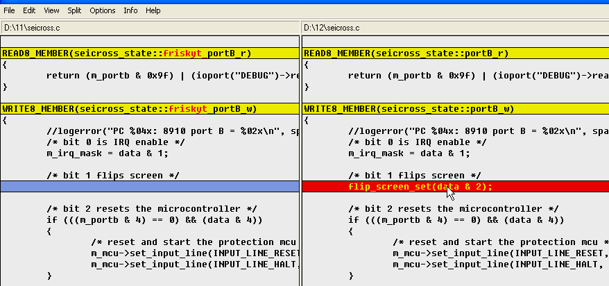Seicross screen is upsidedown since 0.159. Comparing the soucre with 0.158 i found this extra line in drivers/seicross.c: >> flip_screen_set(data & 2); which was added in http://git.redump.net/mame/commit/?id=888b26da776c96a56e61f51b565060f7431e395c This line flipped the screen and if you removed it the screen is correct again! Is it a typo??? |