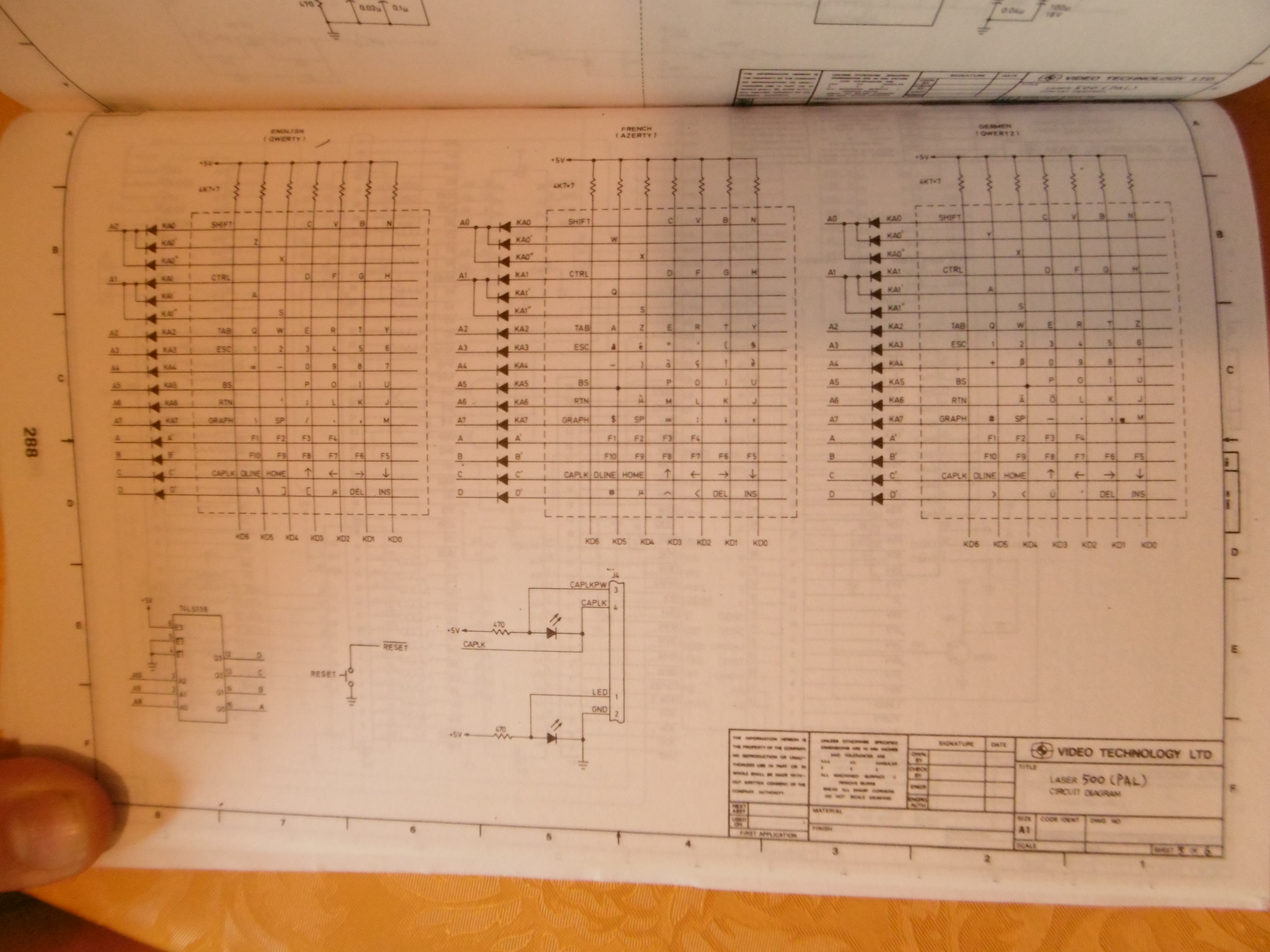 @Robbbert yes it is the same in Laser 350, 500 and 700. As for the schematic, Piero Andreini borrowed a copy of the manual and took some snapshots. I've uploaded the most interesting one for MAME, which is the keyboard schematic. There are two things that needs to be fixed: - keyboard rows A,B,C,D are incorrectly coded in MAME and some of the corresponding keys are not working, like cursor keys (I opened an issue about it). - three separate machine configurations need to be created: ENGLISH (qwerty), FRENCH (azerty) and GERMAN (qwertz). When in FRENCH / GERMAN the bit corresponding to A5-KD5 in the schematic needs to be raised to 1 (A5-KD4 for GERMAN). Also the display driver should point to different offsets in the charset ROM in order to display the french/german character set. Please let me know if you need other pages from the schematic (the whole file is too big to be uploaded). |
