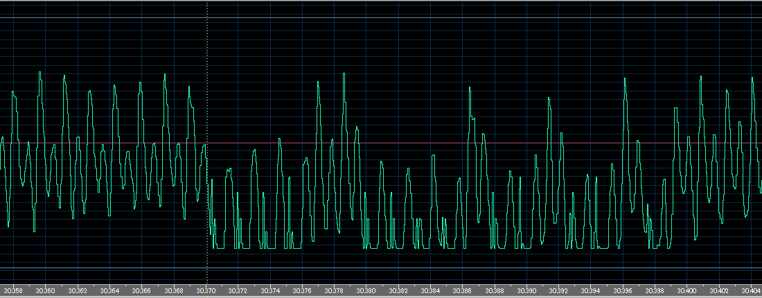 The wave form of the voice "Maggie!" shows that there is a short span wave values are shifted to bottom. It causes the broken noisy sounds. Looks like |