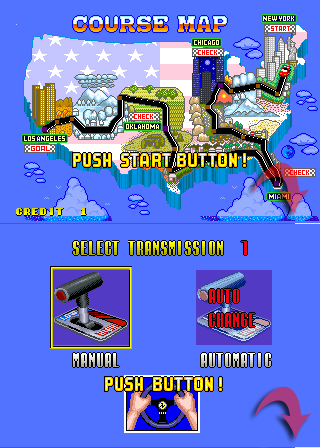 Same here. You can see this glitch right after inserting coin and changing the screen from attract mode to the "course map" screen. One little piece a road line is visible at the bottom of the screen, left side.