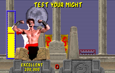 Description There are some glitches on the test your might bonus screen and on the attract mode, it happens almost every time that I play and more often on the second test your might screen (lines aren't supposed to be there). The bug on the attract mode happens when you lose a fight and don't continue, then leave the attract mode running, there will be missing the letters of high scores and in the profile of the fighters.