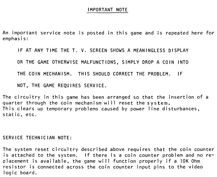 This was confirmed as *correct* behavior a long time ago? -nt-. - Haze On page 2 of both Gremlin's Blockade and Hustle manuals has printed text that reads: If at any time the t.v. screen shows meaningless display or the game otherwise malfunctions, simply drop a coin into the coin mechanism. This should correct the problem. If not, the game requires service. The circuitry in [name of game here] has been arranged so that the insertion of a quarter thru the coin mechanism will reset the restart in the system. This clears up temporary problems caused by power line disturbances, static, etc. ----------- This text is also on Depthcharge [1977] and Head On manuals [1979] too. It isn't printed on Carnival [1980] manual, but it should be same hardware feature as earlier manuals describe. It isn't an arcade bug, but a manufacturer feature for Gremlin games although it might seem like a bug behavior. |