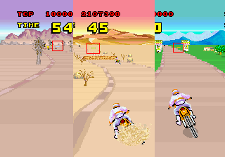 The glitch can also be seen in the arcade pcb. It can be seen in 1:52 and 1:55 and also on 2:14. It is always placed on the right side of the road. |