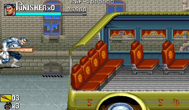 at the end of level 1 there's a red van at the start of level 2 (the bus) the van is not present and punisher fly |