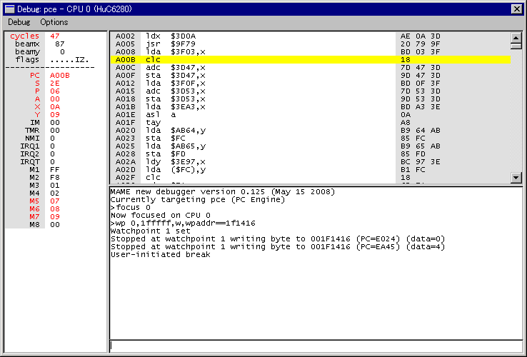 In HuC6280, $1F0000 is PHYSICAL. But debug_watchpoint_set() always uses LOGICAL mask and it's 0xFFFF in this CPU (because of 8-bit). So you can't set the (start) address over $FFFF. I think this CPU is special case but debugger command doesn't consider it. But it's no problem because you can set valid watchpoint without any source fix. (And I have created a lot of cheat codes for PC-Engine games with the debugger) Use "wpaddr" condition. For example : R-Type I The address of a life is $1F1416. So... wp 0,1fffff,w,wpaddr==1f1416See screenshot. It works as expected. If you want to modification simply... src/debug/debugcpu.h #define ADDR2BYTE_MASKED(val,info,spc) (ADDR2BYTE(val,info,spc) & (info)->space[spc].logbytemask)To #define ADDR2BYTE_MASKED(val,info,spc) (ADDR2BYTE(val,info,spc) & (info)->space[spc].physbytemask) "wp 1f1416,1,w" will work. I don't know it's correct and side-effect for other CPUs. ...Is it a "bug"? I think only *ug*y lacks a knowledge of debug command so it's better to set this report as "Acknowledged". |