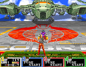 After the "elevator fixing", GI Joe shows some glitches in the elevator (3rd) level, while grates zoom and scroll down. Once you reach the end level boss, the backdrop promptly changes to an obvious wrong one (probably because when the zooming ends, it changes in a common tiles background graphics, but it chooses the wrong one), with robot octopuses popping up from...uh from nowhere? |