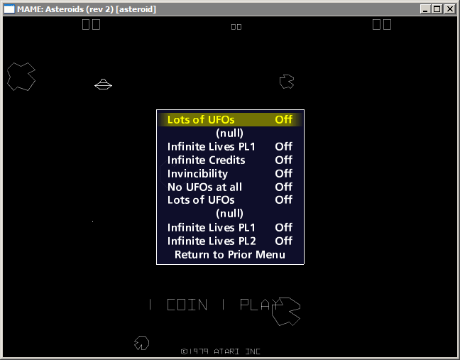 In the game asteroid, these cheats :asteroid:00000020:02F7:00000001:FFFFFFFF:Lots of UFOs :asteroid:60000000:0000:00000000:00000000: :asteroid:00000000:0057:00000005:FFFFFFFF:Infinite Lives PL1 show up in the enable menu as:- Lots of UFOs Off Lots of UFOs Infinite Lives PL1 Off |