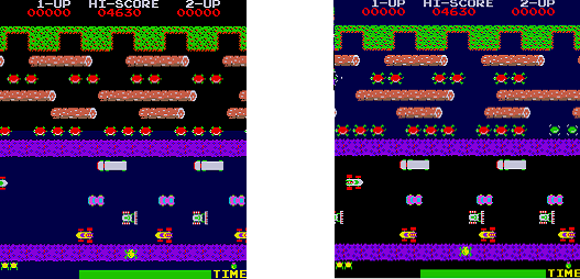 | Description | The top half of the background is blue and bottom half is black. When you have the game set to cocktail mode and it is player 2's turn the black and blue part of the background do not rotate with everything else making the water black and the road blue. | ||||