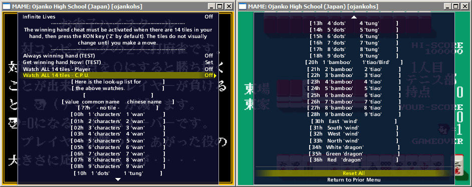 Use the xml cheat file collection from here and copy it to the MAME dir:- http://cheat.retrogames.com/forums/viewtopic.php?t=3110 mame ojankohs -cheat You can't see all these comments which exist in the xml file:- [ Here is the look-up list for ] [ the above watches. ] [ ] [ value common name chinese name ] [ ??h - no tile - ] [ 00h 1 'characters' 1 'wan' ] [ 01h 2 'characters' 2 'wan' ] [ 02h 3 'characters' 3 'wan' ] [ 03h 4 'characters' 4 'wan' ] [ 04h 5 'characters' 5 'wan' ] [ 05h 6 'characters' 6 'wan' ] [ 06h 7 'characters' 7 'wan' ] [ 07h 8 'characters' 8 'wan' ] [ 08h 9 'characters' 9 'wan' ] [ 10h 1 'dots' 1 'tung' ] [ 11h 2 'dots' 2 'tung' ] [ 12h 3 'dots' 3 'tung' ] [ 13h 4 'dots' 4 'tung' ] [ 14h 5 'dots' 5 'tung' ] [ 15h 6 'dots' 6 'tung' ] [ 16h 7 'dots' 7 'tung' ] [ 17h 8 'dots' 8 'tung' ] [ 18h 9 'dots' 9 'tung' ] [ 20h 1 'bamboo' 1'tiao/Bird' ] [ 21h 2 'bamboo' 2 'tiao' ] [ 22h 3 'bamboo' 3 'tiao' ] [ 23h 4 'bamboo' 4 'tiao' ] [ 24h 5 'bamboo' 5 'tiao' ] [ 25h 6 'bamboo' 6 'tiao' ] [ 26h 7 'bamboo' 7 'tiao' ] [ 27h 8 'bamboo' 8 'tiao' ] [ 28h 9 'bamboo' 9 'tiao' ] [ 30h East 'wind' ] [ 31h South 'wind' ] [ 32h West 'wind' ] [ 33h North 'wind' ] [ 34h White 'dragon' ] [ 35h Green 'dragon' ] [ 36h Red 'dragon' ] |