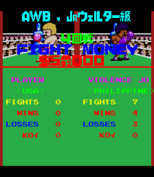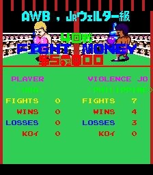 Japanese text (and boxer's face) is shown in VS screen. (from UP to Down) AWB,Jr?????? (AWB Junior welter weight) ??? (4 round match) FIGHT MONEY $5?000 |