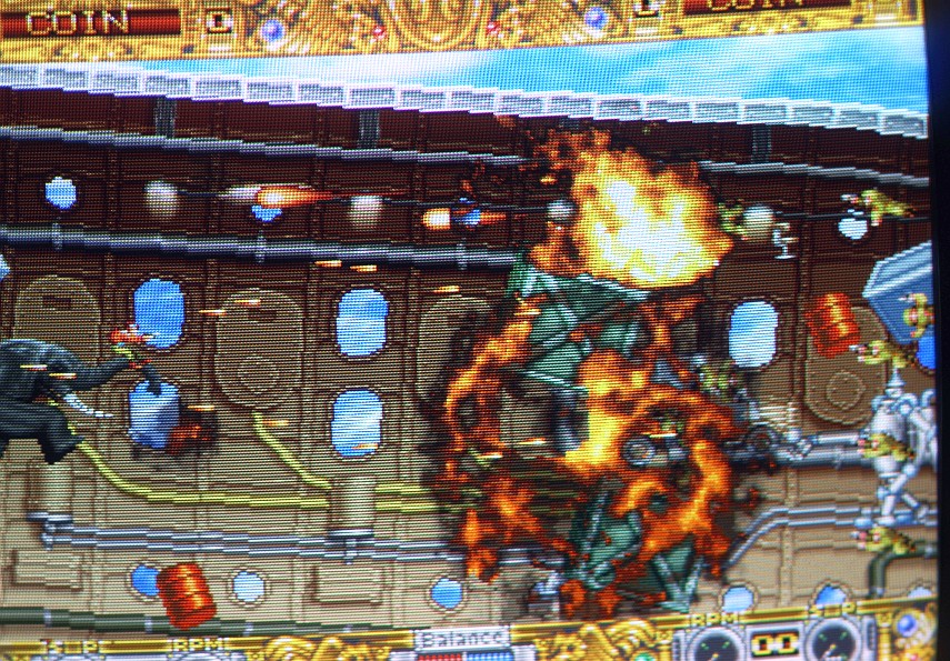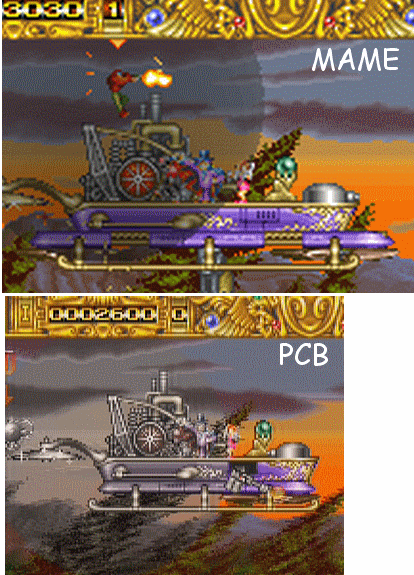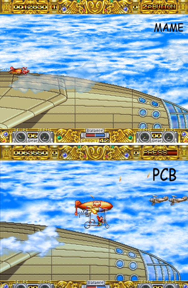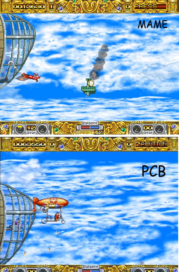I found another "bug" it's the man that can be seen in the cockpit of the big airship (ok maybe it's not an airship but anyway :-) i mean when you see him from outside the airship he appears as a bright shadow (maybe an unwanted transparent effect?) in MAME, while on the PCB he looks like when you see him inside the ship... i will try to do an screenshot of what i mean from MAME later and maybe a video recording from my PCB if it's possible. |