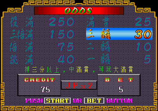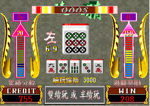During double game, the "Odds" area will be show on the top which cover the words"Cai Yi Cai"(Guessing). I suspect it is the real show on the PCB. I remember when I played the game on arcade before, there was nothing above the top area. Anyway we need confirmation by side-by-side comparison. Or we can dedude that the event is nothing with odds. The "Odds" subject is the same as in the odds list (as show in 2nd pic). If it does exist there, the colour is also wrong(the one in 2nd pic is correct). |