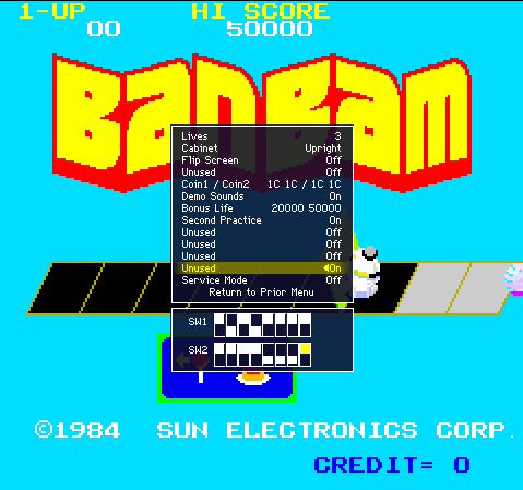 In MAME 0.113u4 did Brian Troha fixed the dipswitches according to the manual. One of the changes was from PORT_DIPNAME( 0x10, 0x00, "Unknown 2-5" ) PORT_DIPSETTING( 0x00, DEF_STR( Off ) ) PORT_DIPSETTING( 0x10, DEF_STR( On ) ) PORT_DIPNAME( 0x20, 0x00, "Unknown 2-6" ) PORT_DIPSETTING( 0x00, DEF_STR( Off ) ) PORT_DIPSETTING( 0x20, DEF_STR( On ) ) PORT_DIPNAME( 0x40, 0x00, "Unknown 2-7" ) PORT_DIPSETTING( 0x00, DEF_STR( Off ) ) PORT_DIPSETTING( 0x40, DEF_STR( On ) ) PORT_DIPNAME( 0x80, 0x00, "Freeze" ) PORT_DIPSETTING( 0x00, DEF_STR( Off ) ) PORT_DIPSETTING( 0x80, DEF_STR( On ) ) to PORT_DIPUNUSED_DIPLOC( 0x10, 0x10, "SW2:5" ) /* These four dips are unused according to the manual */ PORT_DIPUNUSED_DIPLOC( 0x20, 0x20, "SW2:6" ) PORT_DIPUNUSED_DIPLOC( 0x40, 0x40, "SW2:7" ) PORT_DIPUNUSED_DIPLOC( 0x80, 0x80, "SW2:8" ) But there is a 'Freeze' DIP and you must set him (see screenhot) to play the game. |