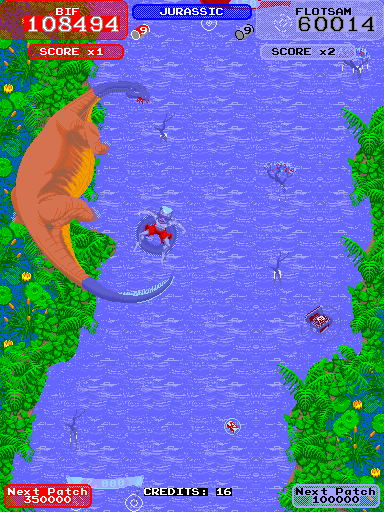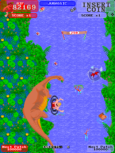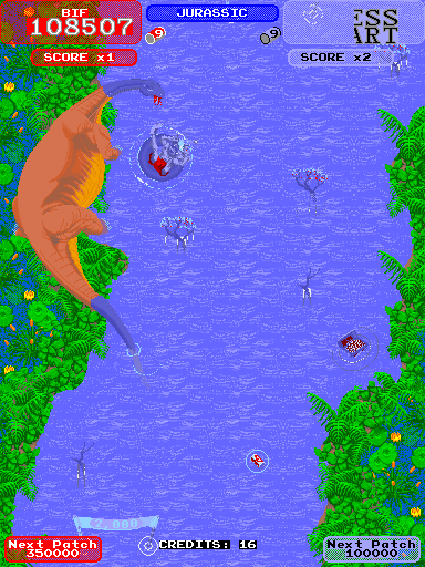 The dinosaur has been fixed! See toobin-MAME 0.210.png screenshot or use toobin-Save State.zip. |
