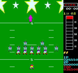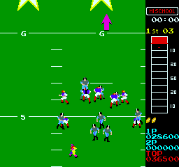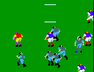 (MAME .65)Update: When any of the players are running diagonally, a football will appear to be in their hand for one frame of animation. In the following shot, you can see five players in addition to the ball handler with footballs.