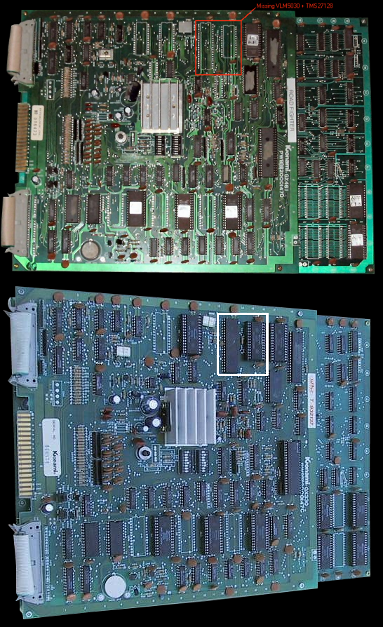 Road Fighter has no VLM5030 speech on his board. Compare the Road Fighter PCB with Hyper Sports (see picture). The VLM5030 speech is the DIP40 chip and the VLM speech rom is the TMS27128,DIP28. |