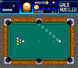 During a game, when you aim your cursor into any pocket, one of the little circles will appear up in the top left corner. Also, is the game running too fast? Watch the demo and see how fast the words "Gals Hustler" are in the top right hand corner and the stars are flashing (just a few examples, there are more). |
