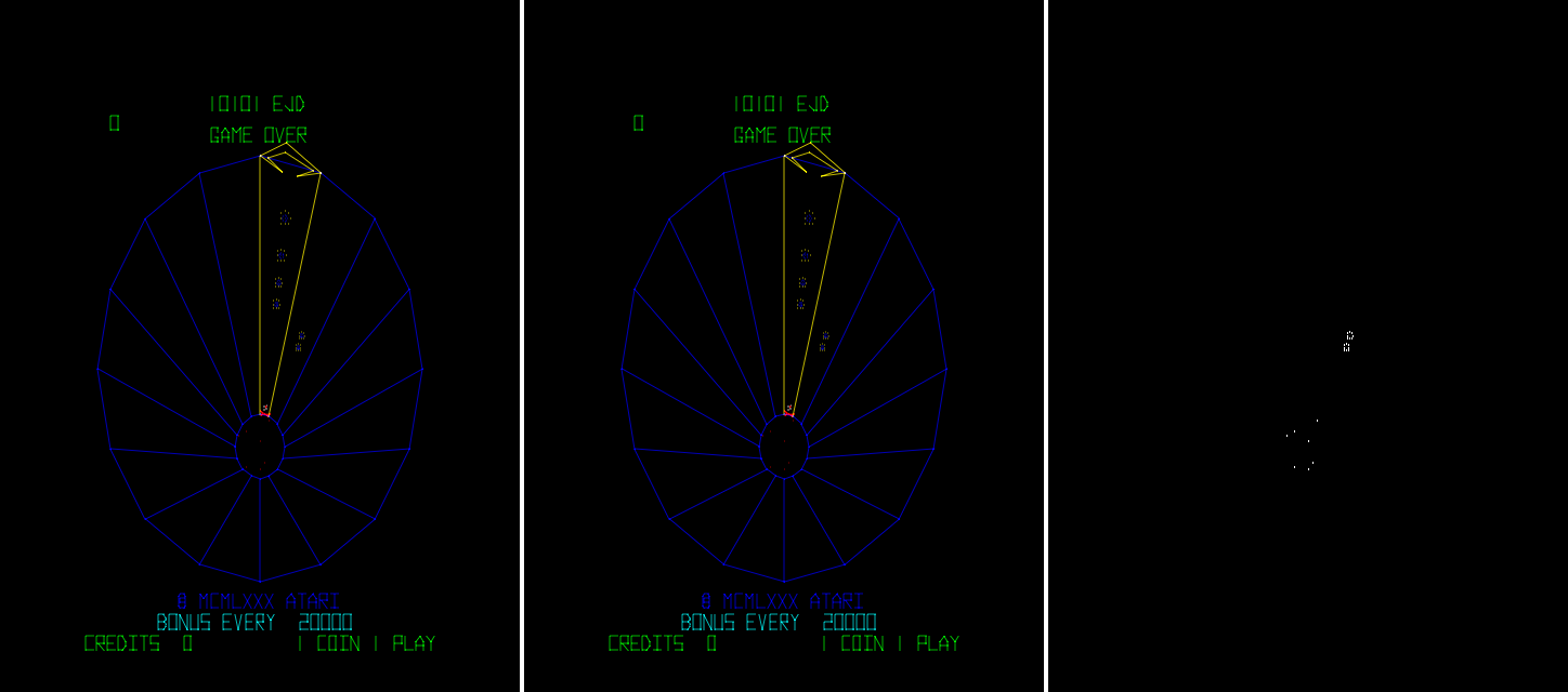 The snapshots of the Atari vector games differn between the 32bit and 64bit version. But there is no visible difference just the raw data seems to differ. I confirmed, that the "-str 2" will create consistent images for either build and attached the snapshots from tempest for analysis. |