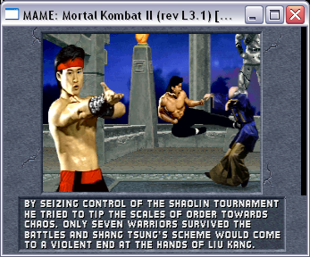 I'm pretty sure that the black area would be simply put off the screen on the real thing, the MK series are known for that type of leftover graphics. Being a blitter type system, it can use any amount of pixels up to its 'limit' of 400x256 or whatever, which it doesn't always use as shown above. In fact, all three of the classic MK games have the same type of graphical 'glitch'. In MK1, there are two black areas at the top on the character bio screen, and more black on the right side of the screen when the character portraits are going down each side. In MK3 and UMK3, some of the stage backgrounds scroll off the side (e.g. Jade's Desert has a blue line on the right), and the right of the vs. screen has more unused areas (the right side dragon, but not the character's graphic under it). Just Midway being lazy I guess. I'd say it's not a bug, but a similar sort of thing as the NeoGeo games when they are displayed in 320x224 mode; a lot of games only used 304 out of the 320 pixels available. |