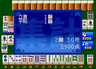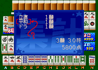 I did some more test of this game and it looks like Fu point calculation is incorrect. (Check this page for Fu points details -> http://homepage2.nifty.com/tagoon/html/fukeisan.html ) I uploaded two pictures, the first one is when I won with Tsumo. It addes 2 Fu points, The total is 30 Fu, no Pinfu scoring. The latter one is wrong Fu points. It should be 20 (fuutei) + 10 (ron) + 4 (anko x 1) = 34 and 40 Fu round-up. But 50 points in this case. Some kind of calc bug of the emulator core could cause a problem like this, but I'm not sure at all. |