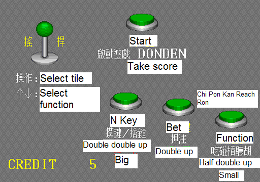 I translate the words beside the keys, as shown in the pic. Joystick: move up and down to choose the Chi, Pon, Kan, Reach and Ron on the screen; move left and right to select tiles. Key 1: Start key; Donden; Take score. Key 2: Take tile or throw (as N in Mahjong Keyboard); Choose Double double up; Select Big in double up game. Key 3: Bet and Double up; Key 4: Key of function use( use joystick to select Chi, Pon, etc.); Half double up; Small in double up game. So the key function in later IGS mahjong games are overlapped. BTW, if Luca saw this notes, I would reminder him that the PCB layout in the igs017.c mislable the CPU in sdmg2 as IGS031, it should be IGS017 as seen on the real PCB. |