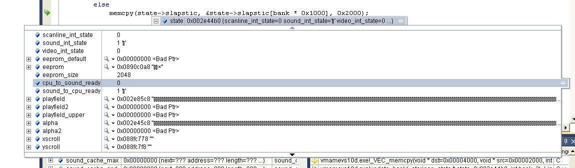 got a backtrace in Visual Studio 2010:> vmamevs10d.exe!update_bank(_atarigen_state * state=0x002e44b0, int bank=2) Line 479 + 0x27 bytes C++ vmamevs10d.exe!slapstic_postload(running_machine * machine=0x0023faa0, void * param=0x00000000) Line 490 + 0xf bytes C++ vmamevs10d.exe!state_save_read_file(running_machine * machine=0x0023faa0, _mame_file * file=0x09160588) Line 596 + 0x15 bytes C++ vmamevs10d.exe!handle_load(running_machine * machine=0x0023faa0) Line 1641 + 0xd bytes C++ vmamevs10d.exe!mame_execute(_core_options * options=0x07dc34a8) Line 328 + 0xe bytes C++ vmamevs10d.exe!cli_execute(int argc=9, char * * argv=0x07dc3448, const _options_entry * osd_options=0x035240b0) Line 177 + 0x9 bytes C++ vmamevs10d.exe!utf8_main(int argc=9, char * * argv=0x07dc3448) Line 318 + 0x12 bytes C++ vmamevs10d.exe!wmain(int argc=9, wchar_t * * argv=0x07dc36b0) Line 82 + 0xd bytes C++ vmamevs10d.exe!__tmainCRTStartup() Line 278 + 0x19 bytes C vmamevs10d.exe!wmainCRTStartup() Line 189 C Code at fault looks like this: memcpy(state->slapstic, &state->slapstic[bank * 0x1000], 0x2000); The problem is, that state->slapstic is NULL. I also added an image showing all the values of state since a few other pointers are also NULL. |