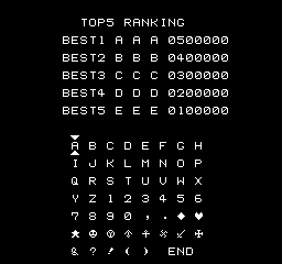 | Description | If you let the demo run, the High Score table will be displayed after a few moments. You can see the character set used to enter the initials (similar to what is happening in Mad Crasher and Vanguard II). This happens in all the three sets. | ||||