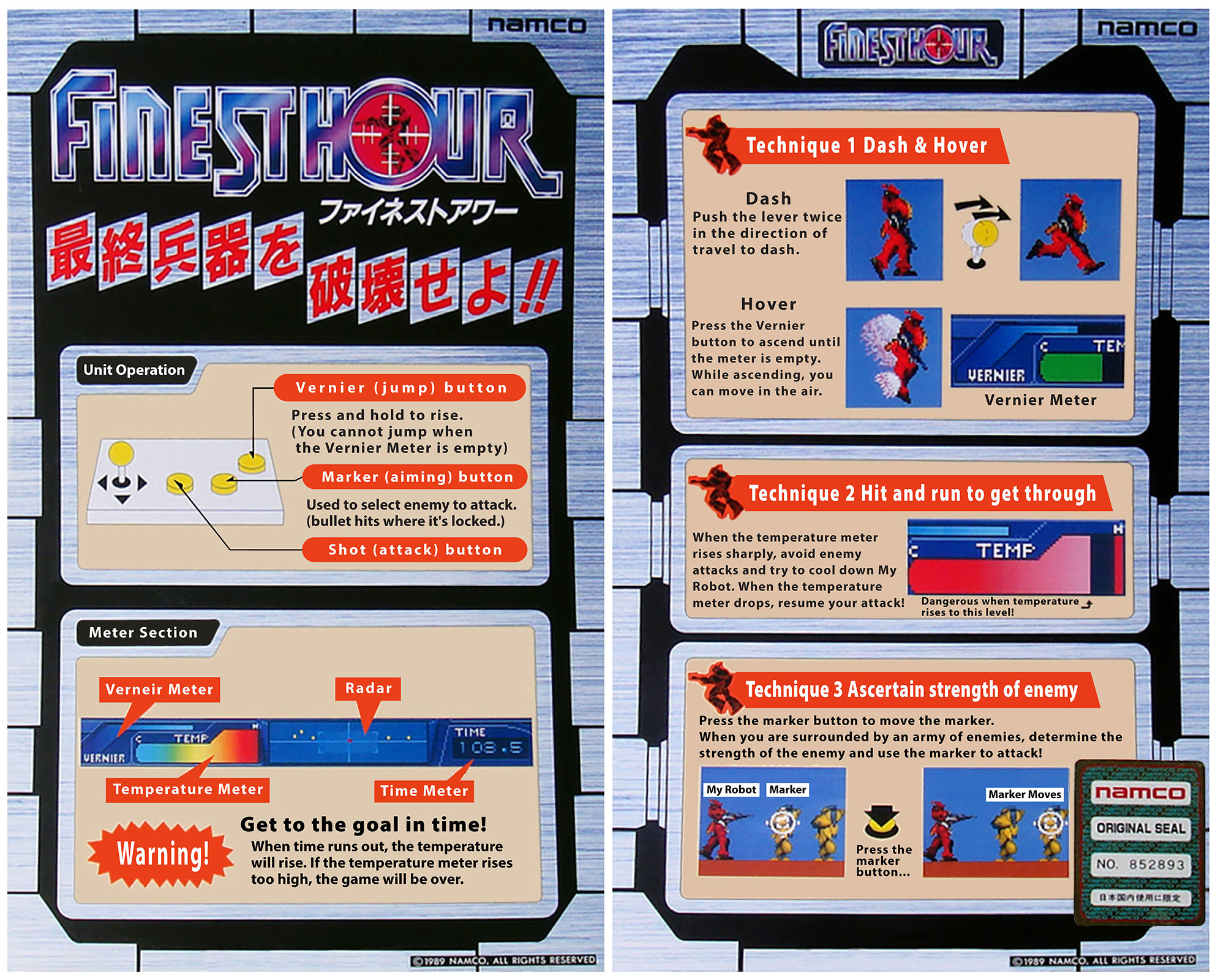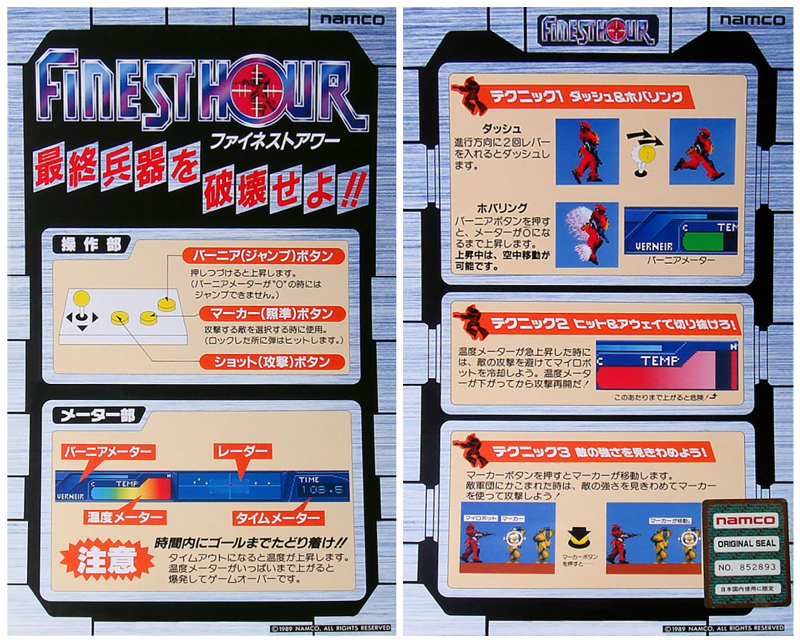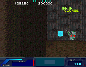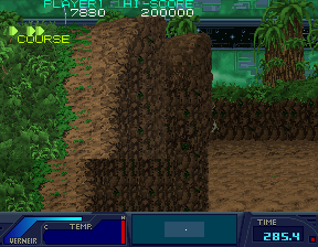 I noticed in the recent Finest Hour livestream that Haze was not using the marker button to select targets. While this game does auto-target the nearest enemy, the middle button lets you cycle through targets when multiple enemies are on the screen. It is probably most useful when selecting which part of a boss to shoot at... Since this game was only released in Japan, the instructions are hard to come by. I will upload photos of the original Japanese cards as well as a simple English translation. I'm not sure if this will make the game any easier to play. The top of the Card says Finest Hour, Destroy the final weapon !! Btw, I have noticed that in addition to the pits you can fall into, sometimes when you fly in the air you will land on an invisible ground plane and be able to walk in the sky. It probably corresponds to the pit below, as if the ground plane coordinates are in the wrong location in that vertical slice of the screen. |