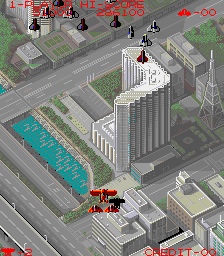 I've found a Tokio/Scramble Formation bootleg PCB gameplay video on Youtube. It shows that the plane shadow is transparent, instead of solid black: And this is another video from the Taito Legends PS2 version of the game, which shows a transparent shadow too (I thought the PS2 version used MAME source code for emulation): Maybe this helps on providing emulation accuracy, since the bootleg version is the only one fully working in MAME... until someone provides a MCU dump/exploit of the original PCB. Another detail from the PS2 version is that the plane shadow is actually visible on the higher areas of the game as well, and not only over the clouds/near the streets as I supposed before. Again, this still needs confirmation against an original PCB, since this bootleg video doesn't show these higher areas. |