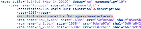 I don't understand exactly where the bug should be... in the UI, it is correctly displayed in listxml output, when opened with a xml editor, I correctly get <manufacturer>Funworld / Öhlinger</manufacturer> (see the attached png) what is the problem? that it's not human readable? that other text editors which do not handle correctly UTF-8 encoding might display the wrong char? MAME is acting as expected, I do not see the issue |