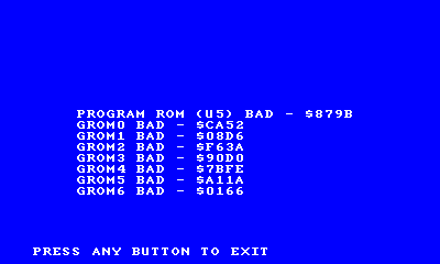Start the game. Wait until the attract mode. Press F2 (service Mode) and select 'DIAGNOSTICS' -> 'MEMORY TESTS' -> 'ROM (U5, GROM0-GROM7)'. |
