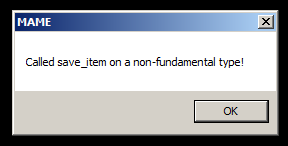 "Called save_item on a non-fundamental type!" message on crash before OK in a number of drivers (assumed all sets in driver - unless noted), including: dynax.c - gekisha, majrjhdx, mjreach, tenkai, tankai2b, tenkaibb, tenkaicb, tenkaid, tenkaie All sets in model1.c model2.c - daytona, daytona93, daytonam, daytonas, daytonat, desert, vcop nmk16.c - raphero All sets in nss.c royalmah.c - cafebrk, cafedoll, cafetime, mjdejav2, mjdejavu, mjifb, mjifb2, mjifb3, mjtensin, mjvegas, mjvegasa segas32.c - harddunk, harddunkj, orunners, orunnersu, scross, scrossu, titlef, titlefu (dual monitor games) All sets in sfcbox.c All sets in snesb.c |