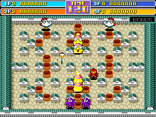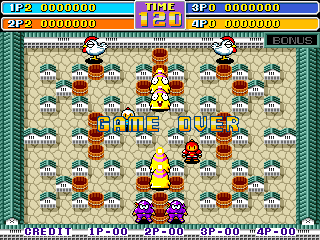 In attract mode, the second tilemap, containing the text "GAME OVER" and the number of credits for each player, is hidden behind the first tilemap containing the playfield. However, the "GAME OVER" text still has priority over the sprites, effectively causing the sprites to disappear behind invisible letters as they move around during the demo (e.g. the blue bomberman in the screenshot). This bug doesn't exist in the parent set bbmanw. It may be an original bug in the bootleg software/hardware (this bootleg has somewhat different video hardware from the original Irem board) that the bootleggers overlooked. |