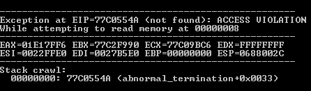 Found the ACCVIO in that list, it's #394: Error #394: UNADDRESSABLE ACCESS: reading 0x00000008-0x0000000c 4 byte(s) @0:00:30.359 in thread 1012 0x77c3554a <msvcrt.dll+0x2554a> msvcrt.dll!abnormal_termination ??:0 |