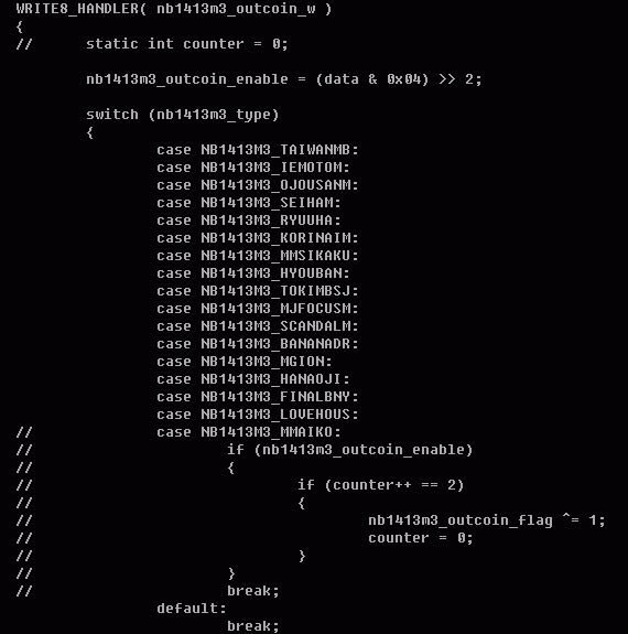 Delete first the NVRAM file mame\nvram\mmaiko.nv Start the game and wait until screen "TEST NOTE IN...". Now you must restart MAME. If you not restart MAME and press F3 (Reset), the NVRAM was not correctly saved. The game boots and you can see the girl, but after INSERT COIN the game reboots and shows the "TEST NOTE IN..." screen. You must restart MAME to correctly save the NVRAM. The other game in the driver is Maikobana (Japan 900802), mostly identical to [BET] and this works fine. After checking the DRIVER_INIT for both games there is an extra outcoin_enable check in src\mame\machine\nb1413m3.c. I removed this check (see screenshot) and the game works fine without restart MAME. |