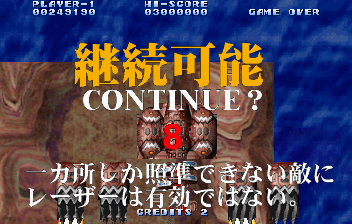 | Description | When playing, the popmessage "Reduction Enable 0102 - Contact MAMEDEV" will appear during and remain for the duration of the next to last boss fight (Fifth stage boss, thanks SgtSarros!) | ||||