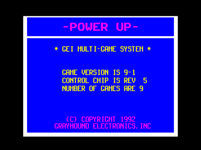 13 game ROMs are loaded in the Greyhound multi-game system driver, but the game itself only reports nine games available. The ROM test lists 9 ROM banks detected and good. The in-game game list then contains 13 entries and scrolls out of the proper area. Only the first nine are selectable. |