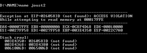 Joust 2 crashed after OK since 0.145u8. "cvsd" was accidentally replaced with "cvsd_sound". Changed line 16 in includes\williams.h from m_cvsd_sound(*this, "cvsd_sound"), back to m_cvsd_sound(*this, "cvsd"), and line 1696 in drivers\williams.c from MCFG_WILLIAMS_CVSD_SOUND_ADD("cvsd_sound") back to MCFG_WILLIAMS_CVSD_SOUND_ADD("cvsd") Don't forget to delete all williams.o objects before you compile! |
