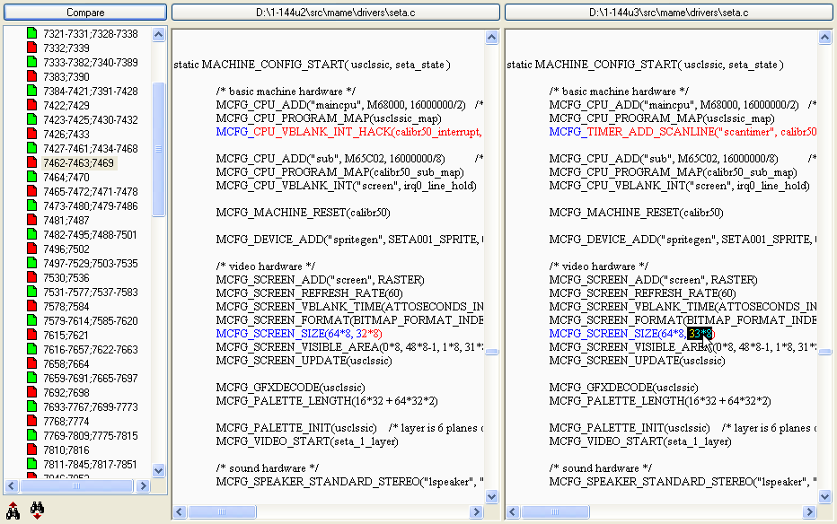 U.S. Classic has a big ugly bar on the left since 0.144u3. Comparing the soucre from 0.144u2 and u3 i found a typo in drivers\seta.c (see snapshot). Changing the MCFG_SCREEN_SIZE in line 7659 back to 32 the graphic bug is gone! |