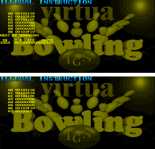 In every case, after the 3rd launched ball, the game resets. Follow-up by twisty: Here's what happens just before the reset... Update by BarnacleEd: vbowl as of (at least) 0.118u4 no longer crashes with an illegal instruction after the third ball, instead crashing with an illegal instruction at the very end of play when it should, I assume, return to attract mode. |