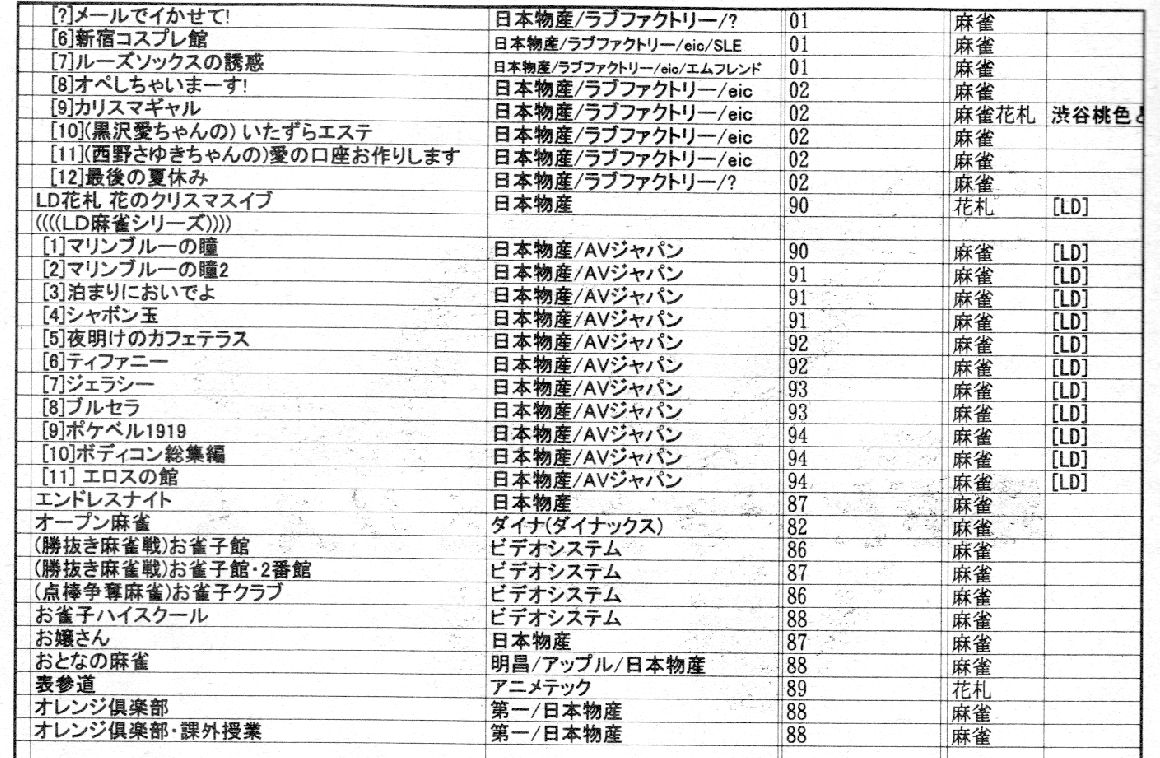 One of this list maybe wrong. For example "LD Hanafuda Hanano Christmas Eve" would not be a LD game and the description should be "AV Hanafuda ...." like other AV Hanafuda series such like: AV Hanafuda Hanano Ageman (1990.08) AV Hanafuda Hanano Angel Face (1991) AV Hanafuda Hanano Karayaburi (1991.06) AV Hanafuda Hanamaruko chan (1990.10) And for other LD Mahjong series titles, I have already submit the full list including release year and month. |