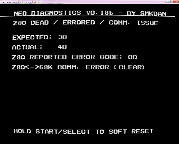 Issue is in neogeo.c, can't be selecetd from Driver menu. The Neo Diagnostics v.018b from smkdan show that there is a problem with Z80 <-> 68K communication -> See attached image. In neogeo.c sourcecode beginning from line 590 this is listed: /* this is a guess */ audio_cpu_clear_nmi_w(space, 0, 0); Maybe Neo Diagnostics can help to identify the issue. |