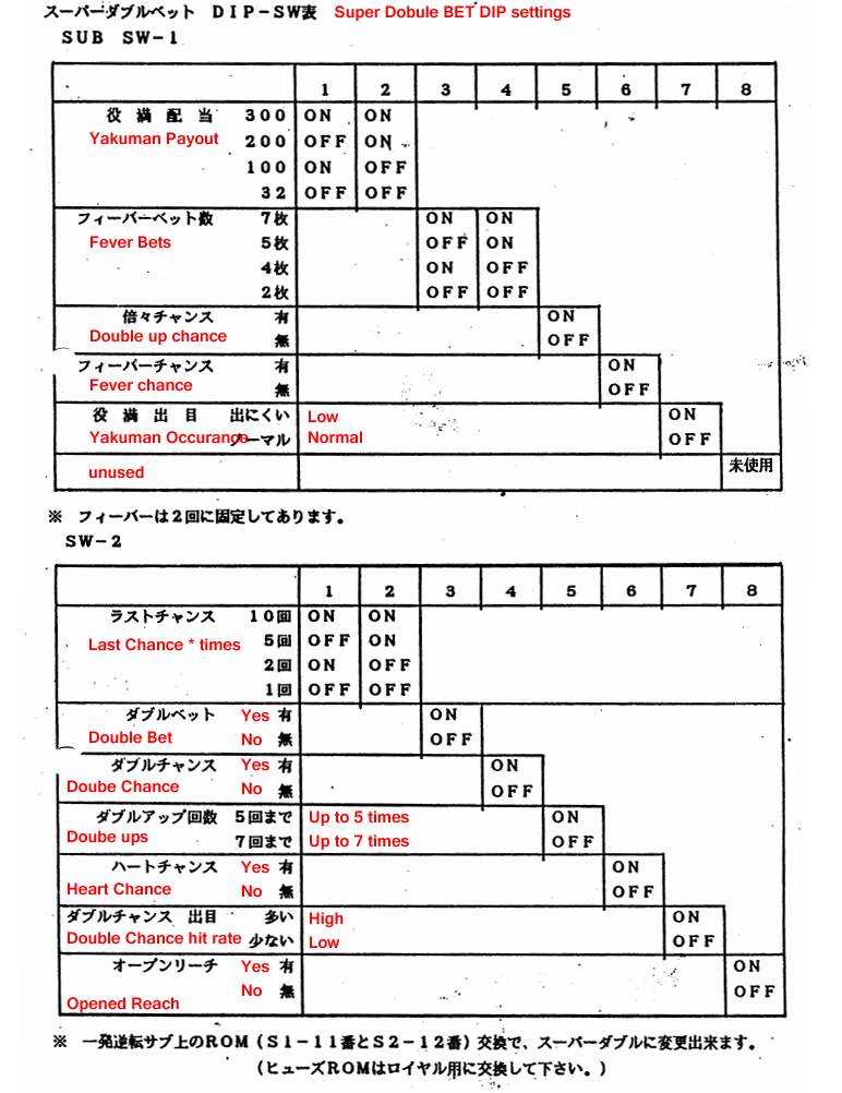 I received this information via a mail. This pdf contains the manual of ippatsu, http://www.co-protec.jp/manual/mahjong/IPPATU%20GYAKUTEN.pdf It describes Ippatsu Gyakuten was provided as a sub board for any Royal Mahjong games, how to convert boards, functions and DIP switch settings. And Ippatsu can be converted into "Super Duble BET" version by swapping S1-11 and S2-12 on the sub board of ippatsu. Here's DIPs: -Main DIPSW Pay out rate 1-4: (crabbed scan) Bet Max 1: SW6 ON, SW7 ON Bet Max 3: SW6 OFF, SW7 ON Bet Max: 5: SW6 ON, SW7 OFF Bet Max 10: SW6 OFF, SW7 OFF Open Reach Yes: SW8 OFF Open Reach No: SW8 ON - Sub DIPSW-1 Yakuman Cut: SW1 OFF, SW2 OFF 3-bai man Cut: SW1 ON, SW2 OFF Baiman Cut: SW1 Off, SW2 On No Cut: SW1 On, SW2 On Yakuman Prize A (300): Sw3 Off, Sw4 Off Prize B (200) :On, Off Prize C (100): Off, On Prize D (32): On. On Double Ups 3 times: Sw5 On, Sw6 On 4 times: Off On 5 times: On Off 6 times: Off Off Last Chance 5 times: Sw7 off 3 times: on Unused: sw8 - Sub DIPSW2 Double Chance (1/8) Yes: Sw1 off No: Sw1 on 2nd Bonus Yes: Sw2 off No: Sw2 on Double BET Yes: Sw3 off No: Sw3 on Heart Chance no: Sw4 on Sw5 on Heart Chance 1/8 (12.5%): off on Heart Chance 1/4 (25%): on off Heart Chance 1/2 (50%): off off Closing credits 300: Sw6 off, Sw7 off Closing credits 500: Sw6 on, Sw7 off Closing credits 800: Sw6 off, Sw7 on Closing credits 1000: Sw6 on, Sw7 on Message Yes: sw8 off No: sw8 on |