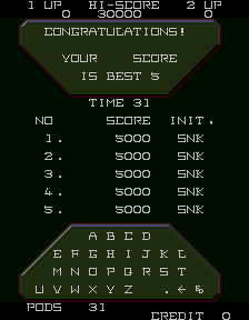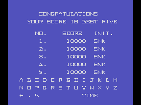 | Description | Let the attract mode run until it shows the Hi Score table. You will see that among the top records, you can see the set of characters and text used to enter the initials when you have achieved a record. | ||||