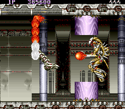 GOING WHERE NO TESTER HAS GONE BEFORE!! The trigger to the 3rd level Boss is the 6th big structure (the last before the Boss). Destroy it and the bastard will show up! You don't need to destroy all of them, just the last one. It's definitely not a bug (but if you have the PCB and want to confirm it anyway it would be cool). :) STILL, the 1p start screen scrolling texts needs to get fixed. |