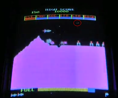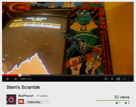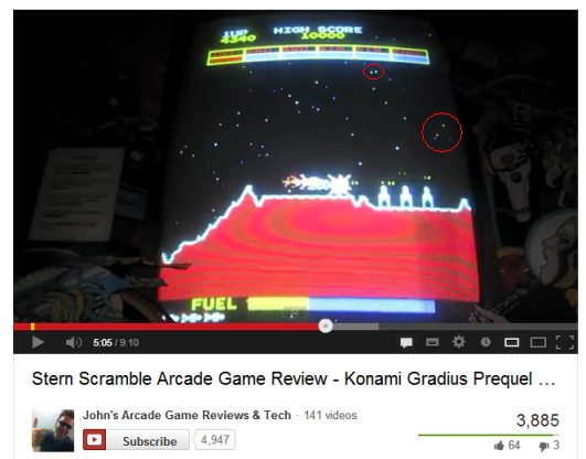 i have noticed that the background stars in mame scramble are very incorrect when compared to the actual pcb i have verified this by watching a number of pcb/cab recordings on youtube (two separate stern cab recordings, plus a recording of the konami version pcb) below: the first and second pics show the two different stern cabs. i have circled in red a couple of star clusters to highlight that they are identical the third pic below is the konami arcade pcb version, and although that particular youtube video is poor, you can still see the two stars together just below where it says '5th' at the top of the screen (i have circled them to highlight) the fourth picture below is the mame version (.149). note the single star in the bottom right corner of the screen near the little flag (i have highlighted it with a red box). you never see any stars in this area in all of the youtube scramble cab/pcb recordings (both stern and konami versions) |
