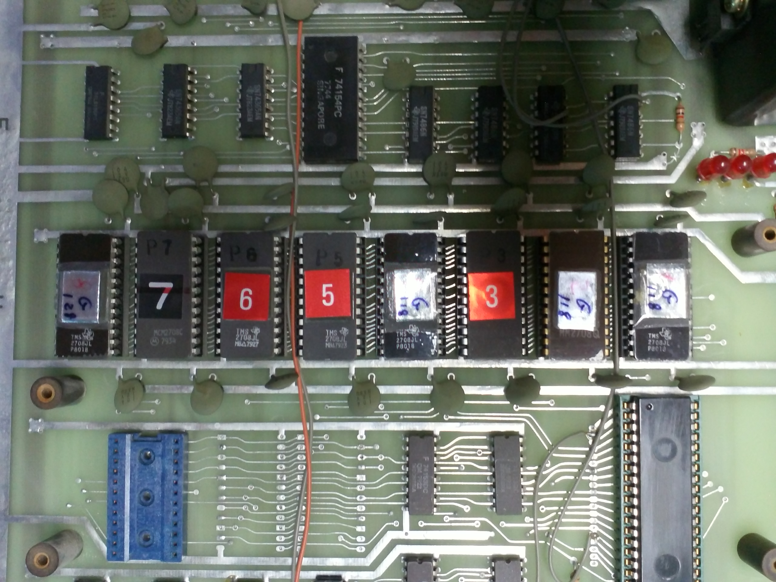 (note, I've attached the cosmicgi PCB picture I was given, 3,5,6,7 appear to have more original stickers / stamping than 1,2,4,8 which are the ones modified for Spanish language on this bootleg) I recommend an original Cosmic Guerilla PCB be dumped for comparison. |